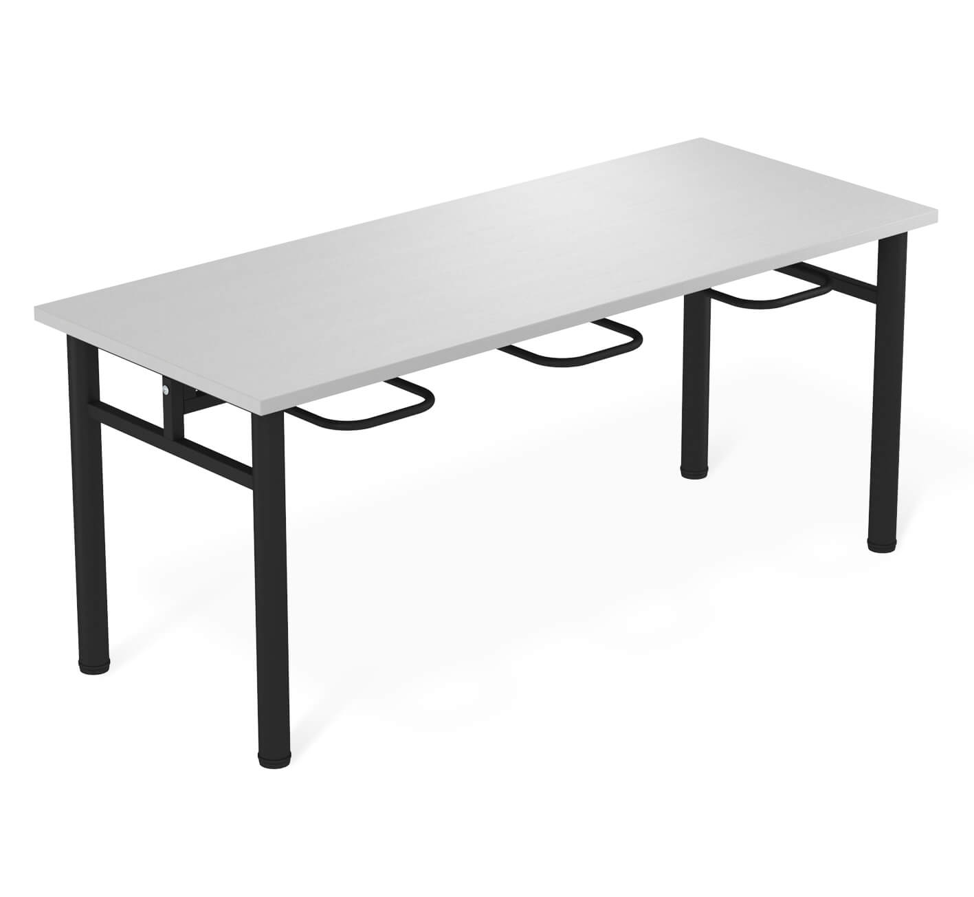 Главная особенность модели — специальные подвесы для размещения табуретов. Благодаря этому табуреты можно легко поднять и зафиксировать, освободив пространство под столом. Такое решение существенно упрощает уборку пола, позволяет быстрее проводить влажную уборку и поддерживать чистоту в помещении.
