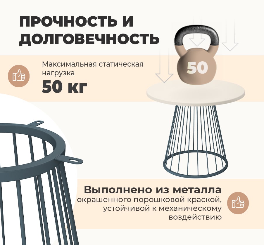 НАДЁЖНОЕ МЕТАЛЛИЧЕСКОЕ ПОДСТОЛЬЕ окрашено порошковой краской, устойчивой к механическим повреждениям и износу. Основание выполнено из трубы 20х20 мм и прутков 10 мм.