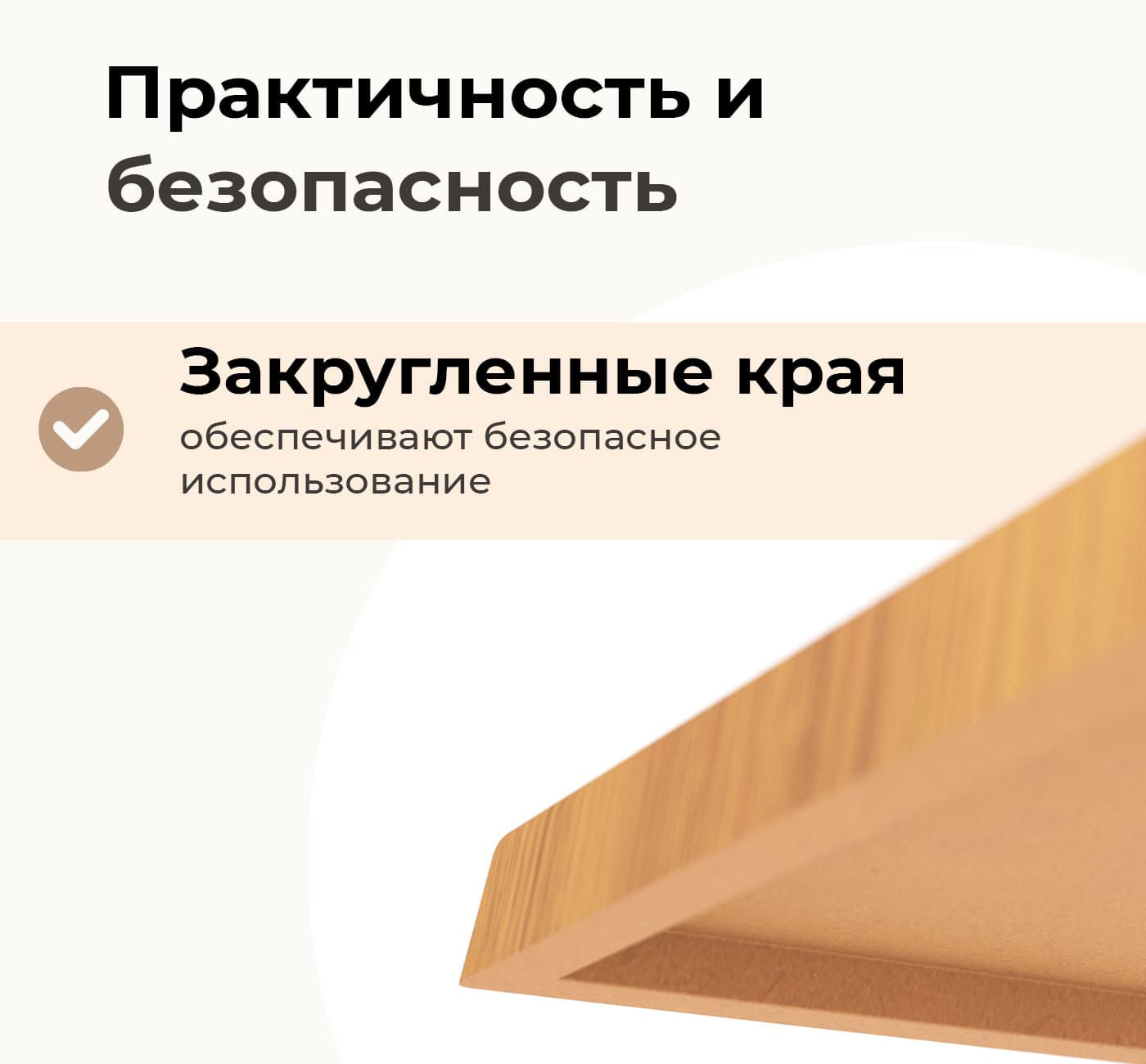 Столешница имеет плавный закругленный переход от лицевой поверхности к боковым кромкам, что добавляет особую эстетику и обеспечивает безопасное использование.