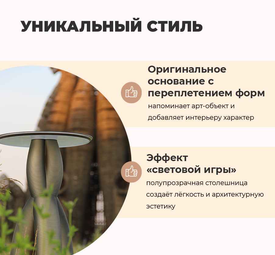 Специальная покраска создает иллюзию металла на солнце, а полупрозрачная столешница подчеркивает игру света и архитектурность форм.