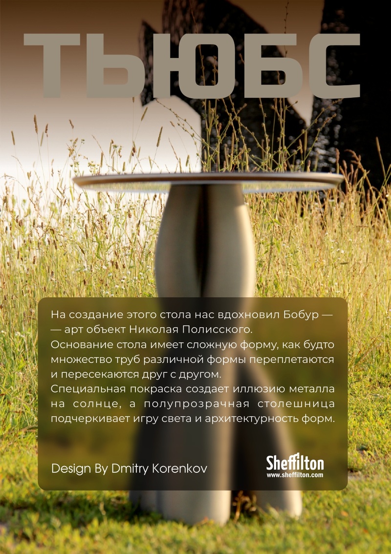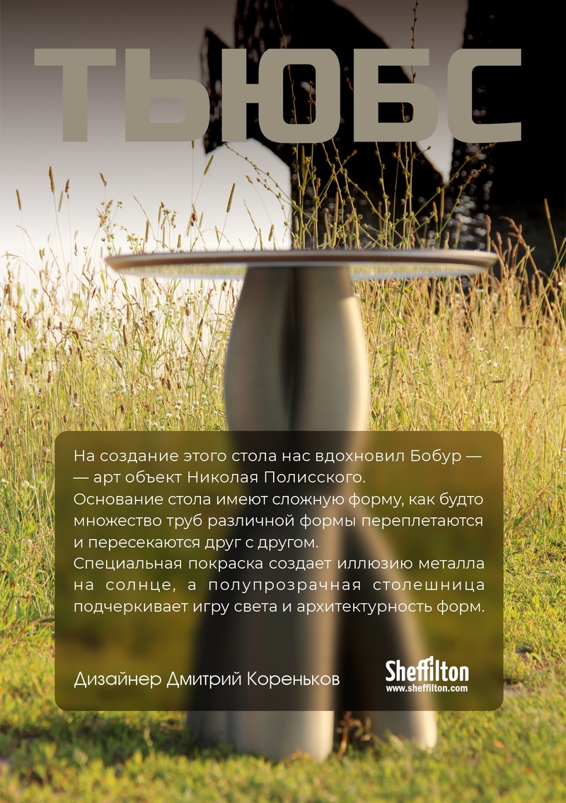 Специальная покраска создает иллюзию металла на солнце, а полупрозрачная столешница подчеркивает игру света и архитектурность форм.