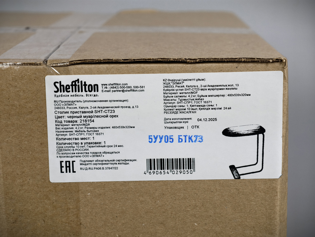 Каркас выполнен их металлической трубы 18 мм и окрашен порошковой краской, устойчивой к механическому воздействию. Столешница выполнена из МДФ с рисунком под натуральное дерево. Размер столешницы 480 на 300 мм. Максимальная статическая нагрузка на столик 5 кг.