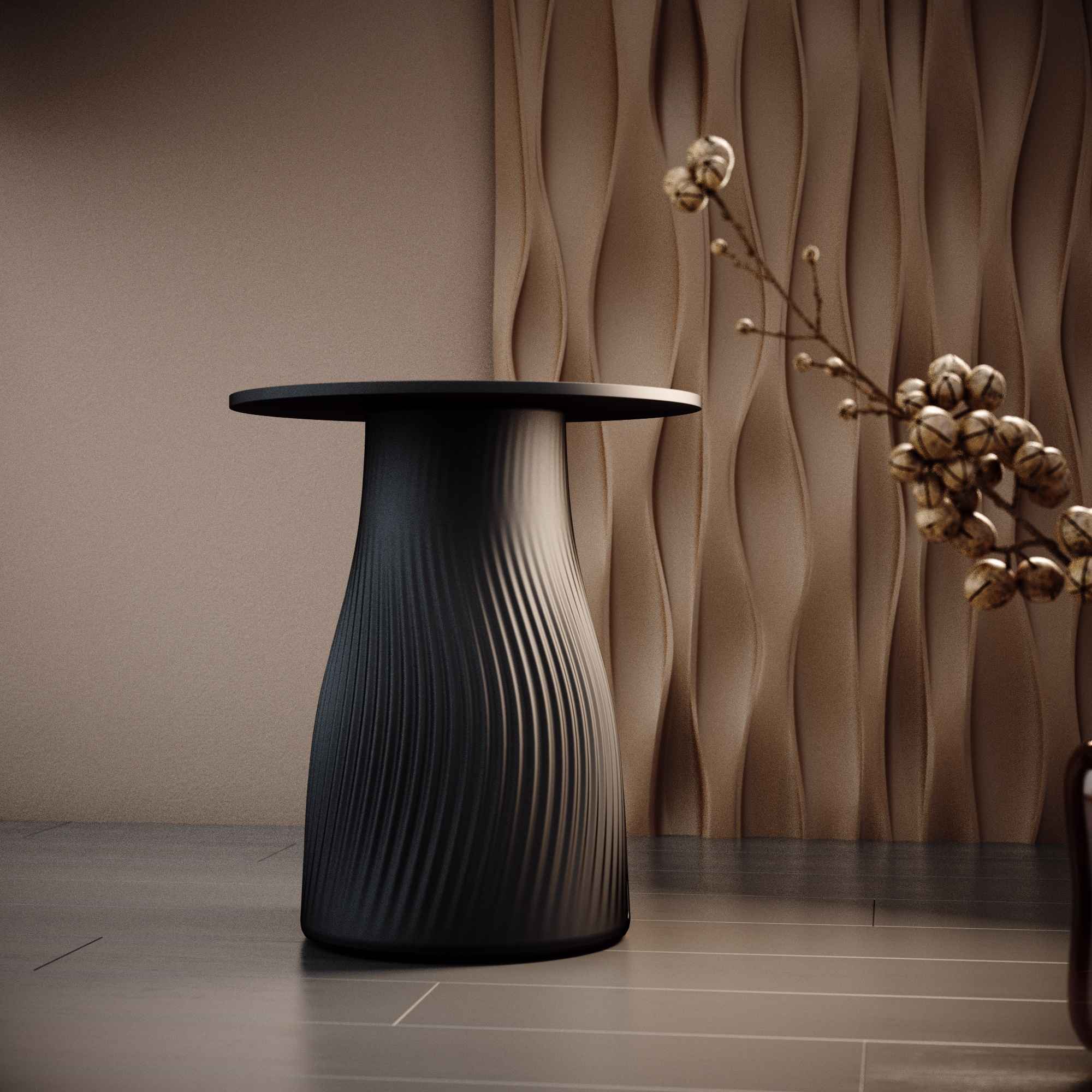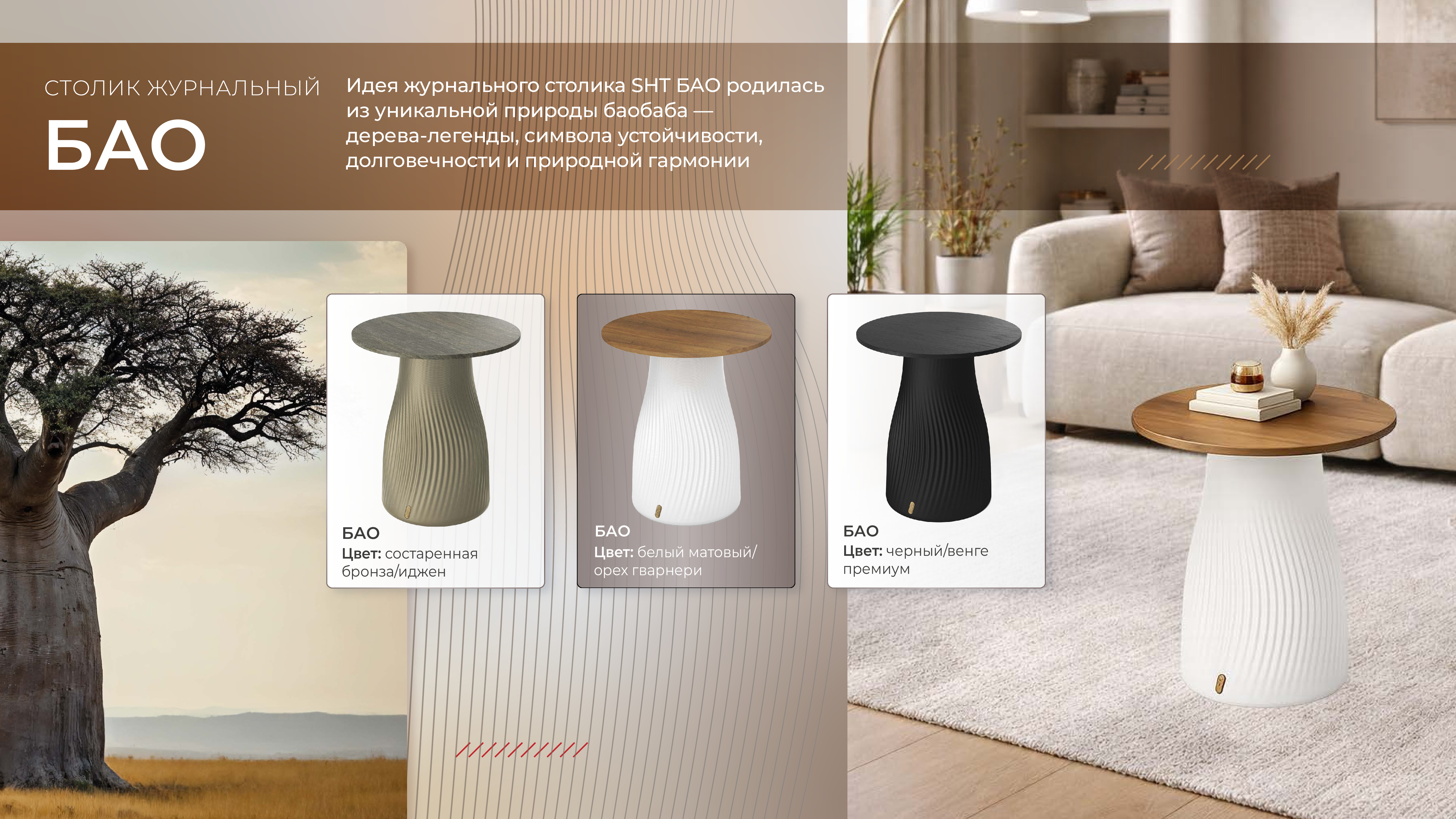 Идея журнального столика SHT БАО родилась из уникальной природы баобаба — дерева-легенды, символа устойчивости, долговечности и природной гармонии. Его характерная форма переосмыслена в современном дизайне: плавно расширяющееся основание напоминает массивный ствол баобаба, а вертикальные линии создают эффект природной текстуры, словно повторяя рельеф коры.