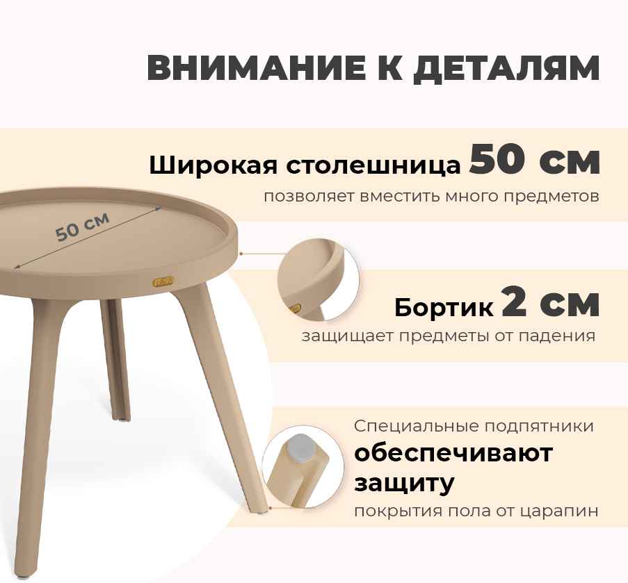 Компактные размеры позволяют легко разместить столик даже в самых маленьких помещениях. А его легкость обеспечивает простоту перемещения — вы сможете менять расстановку мебели по своему желанию без лишних усилий!