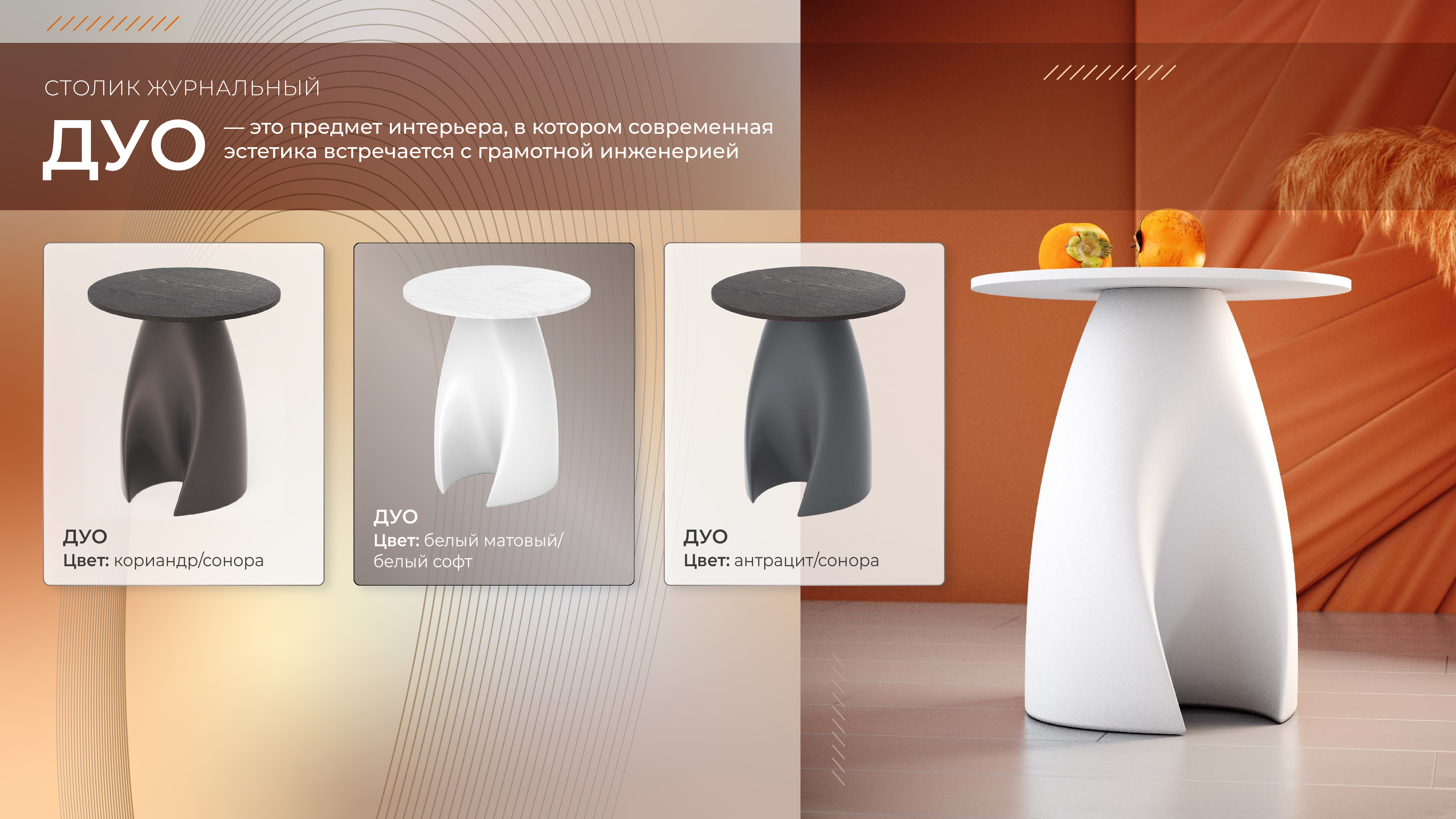 Журнальный столик SHT ДУО — это предмет интерьера, в котором современная эстетика встречается с грамотной инженерией. Его характерная особенность — две симметричные плавные линии основания, которые формируют характер журнального столика — будто два силуэта, встречающиеся в совершенном балансе. Этот дуэт изгибов создаёт выразительную пластику и превращает столик в небольшую архитектурную композицию. Благодаря этому силуэту столик выглядит скульптурным, как мини-объект современного искусства, и легко становится акцентом в любом пространстве: гостиной, спальне, кабинетах, лаунж-зонах, отелях и стильных офисах.