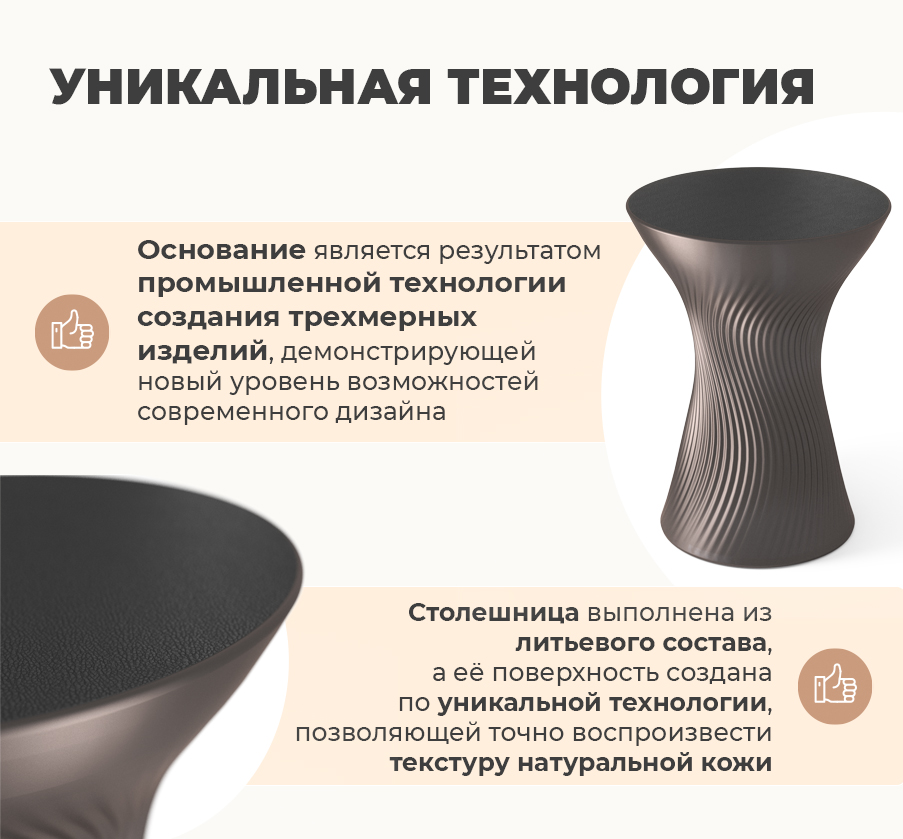 Такой визуальный эффект делает столик выразительным и премиальным, а сама поверхность отличается стойкостью, жёсткостью и стабильностью в эксплуатации.