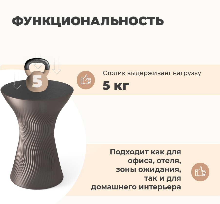 Компактные размеры позволяют легко разместить столик даже в самых маленьких помещениях. А его легкость обеспечивает простоту перемещения — вы сможете менять расстановку мебели по своему желанию без лишних усилий!