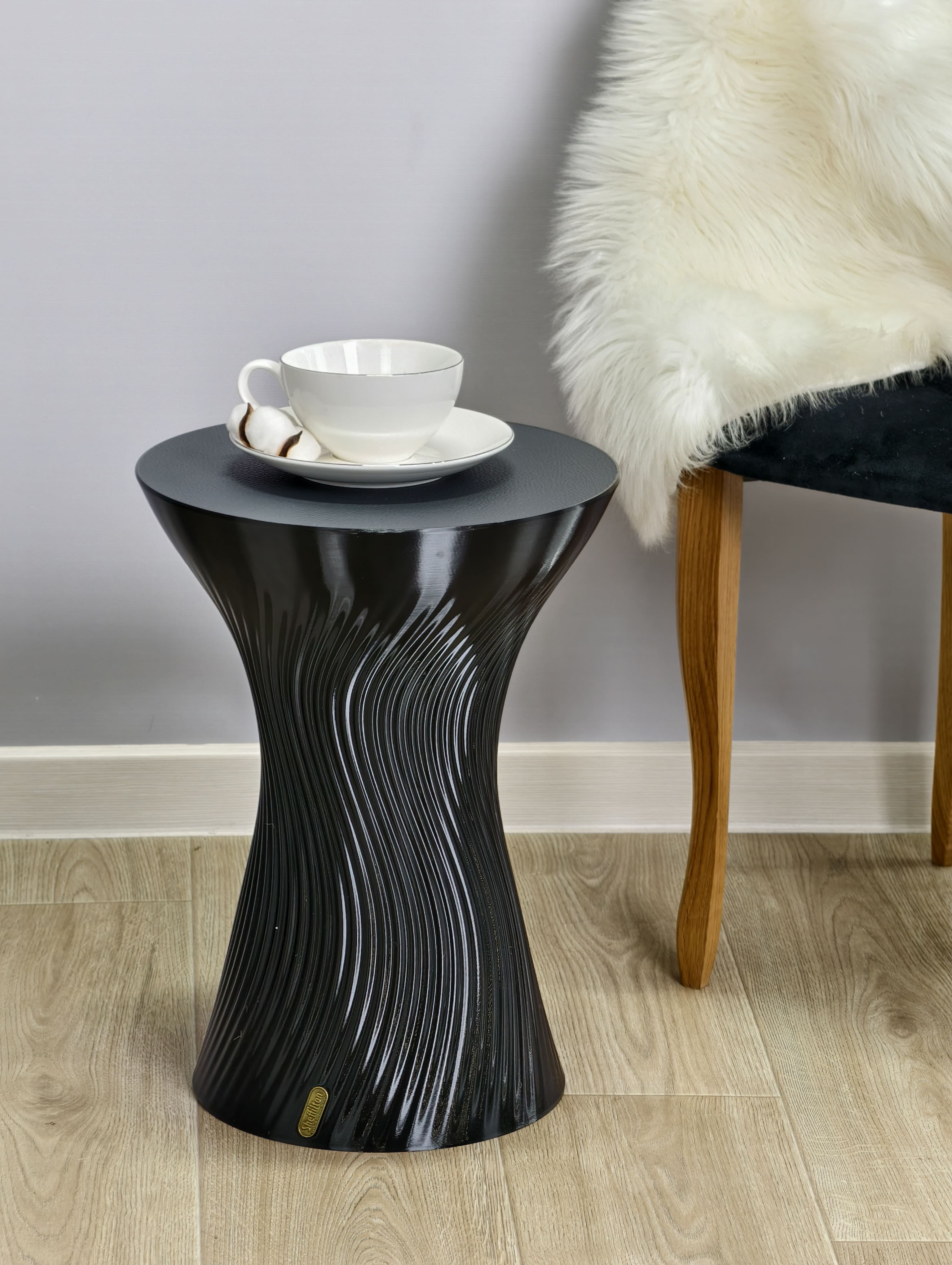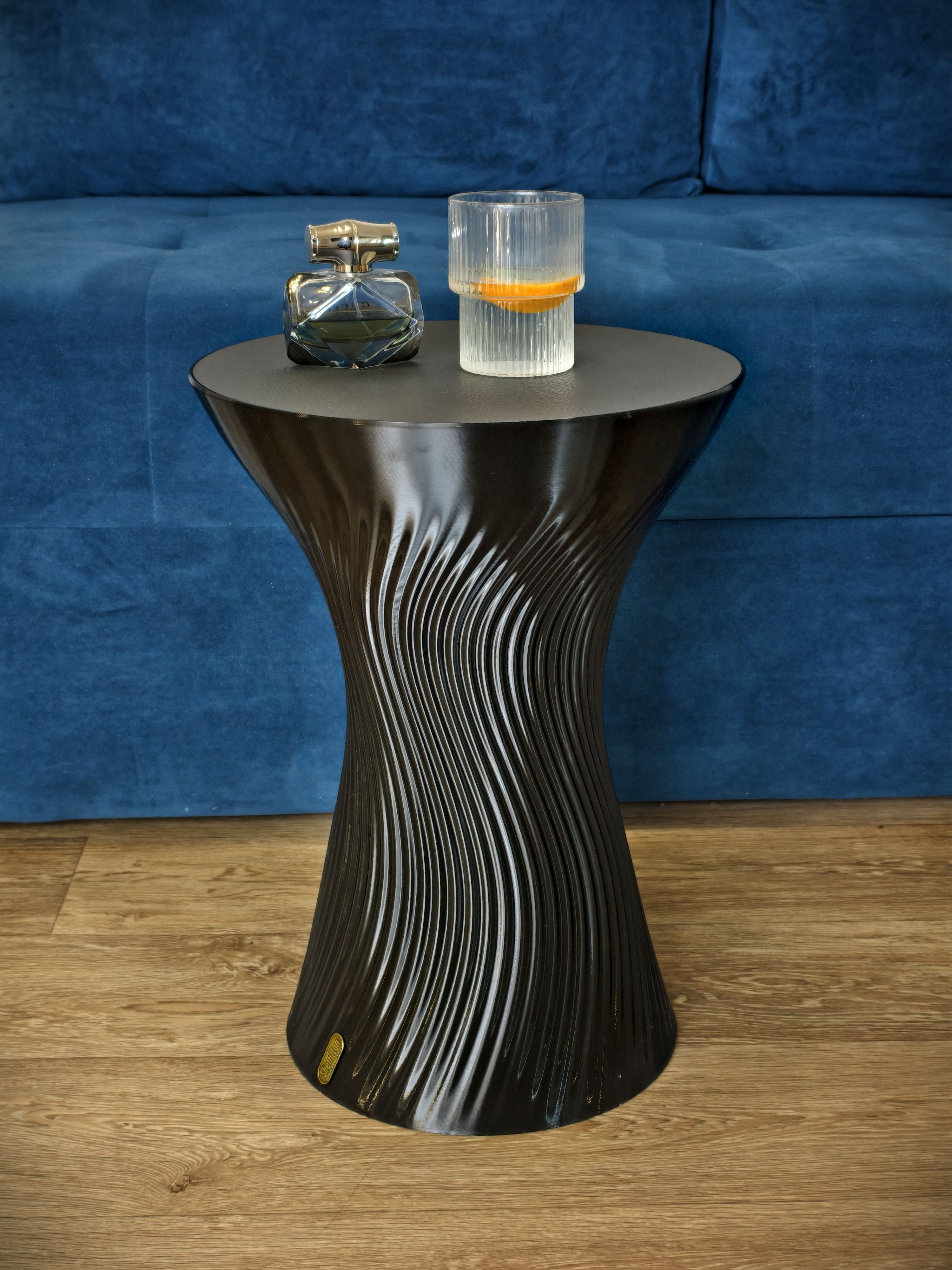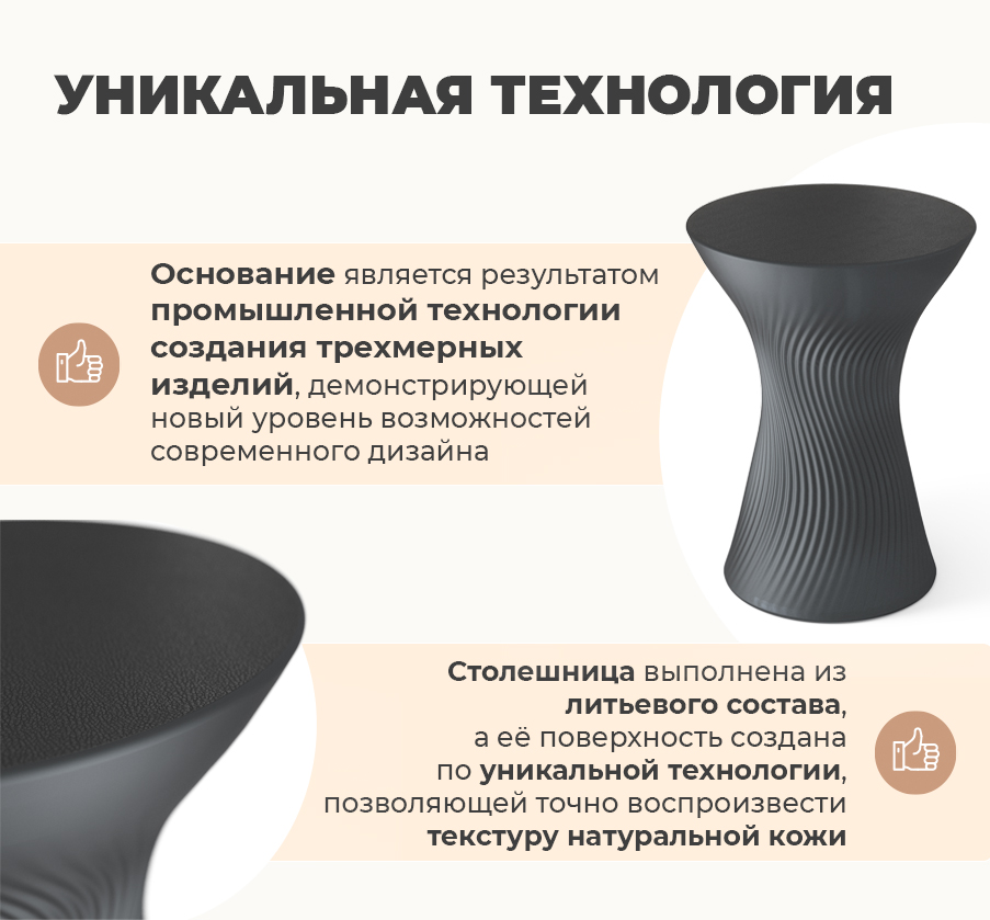 Такой визуальный эффект делает столик выразительным и премиальным, а сама поверхность отличается стойкостью, жёсткостью и стабильностью в эксплуатации.