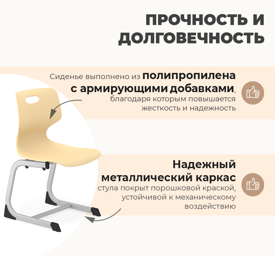 Сиденье выполнено из утолщенного пластика с армирующими добавками, что значительно увеличивает его жесткость и надежность. Надежный металлический каркас стула выполнен из плоскоовальной трубы и покрыт порошковой краской, устойчивой к механическому воздействию. Каждый стул проходит строгие испытания на устойчивость, выдерживая более 50 000 циклов нагружения "сел-встал", что гарантирует его долговечность даже при интенсивном использовании.