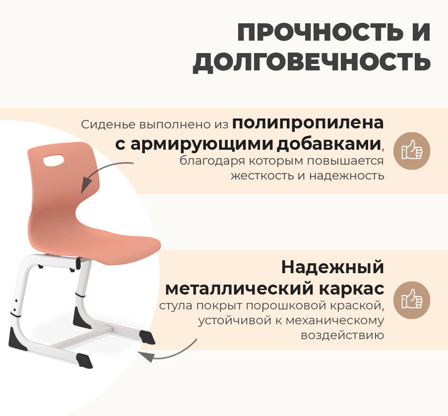 Сиденье выполнено из утолщенного пластика с армирующими добавками, что значительно увеличивает его жесткость и надежность. Надежный металлический каркас стула выполнен из плоскоовальной трубы и покрыт порошковой краской, устойчивой к механическому воздействию. Каждый стул проходит строгие испытания на устойчивость, выдерживая более 50 000 циклов нагружения "сел-встал", что гарантирует его долговечность даже при интенсивном использовании.