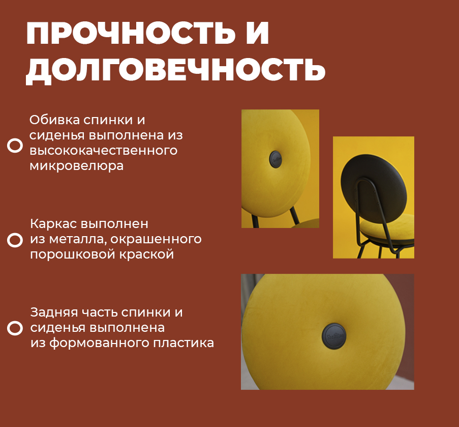 Обивка стула выполнена из качественного микровелюра — тактильного, износостойкого и простого в уходе материала.