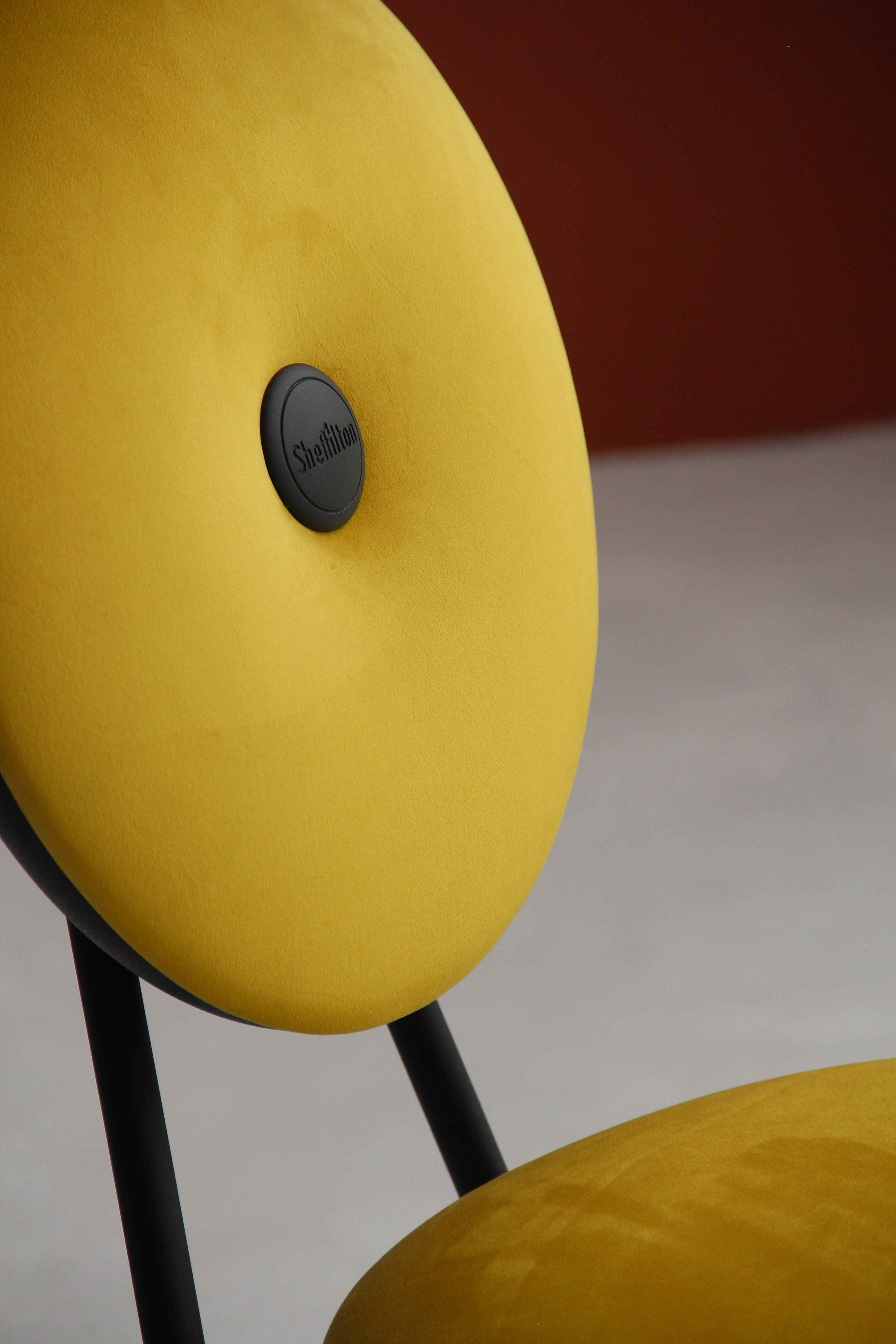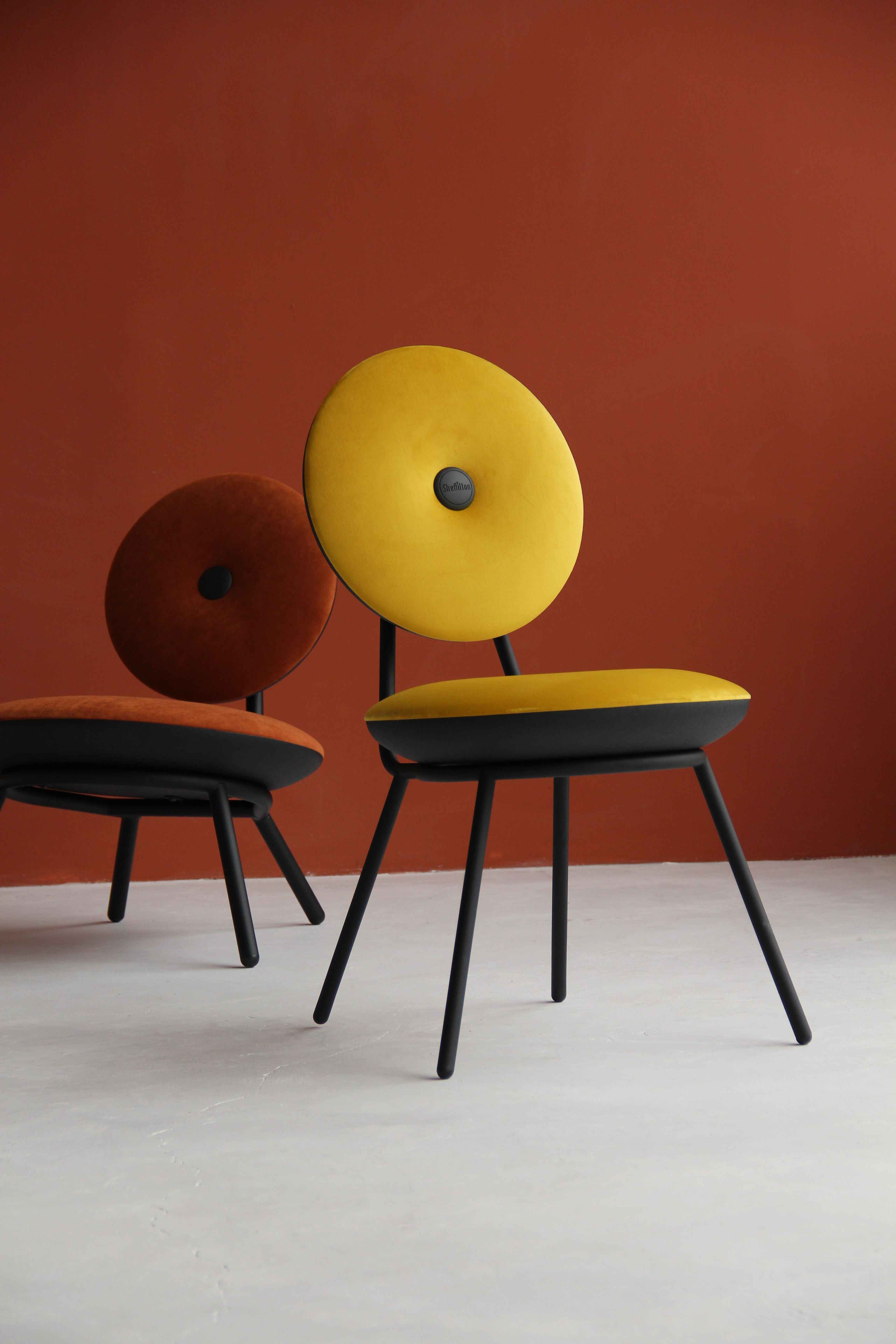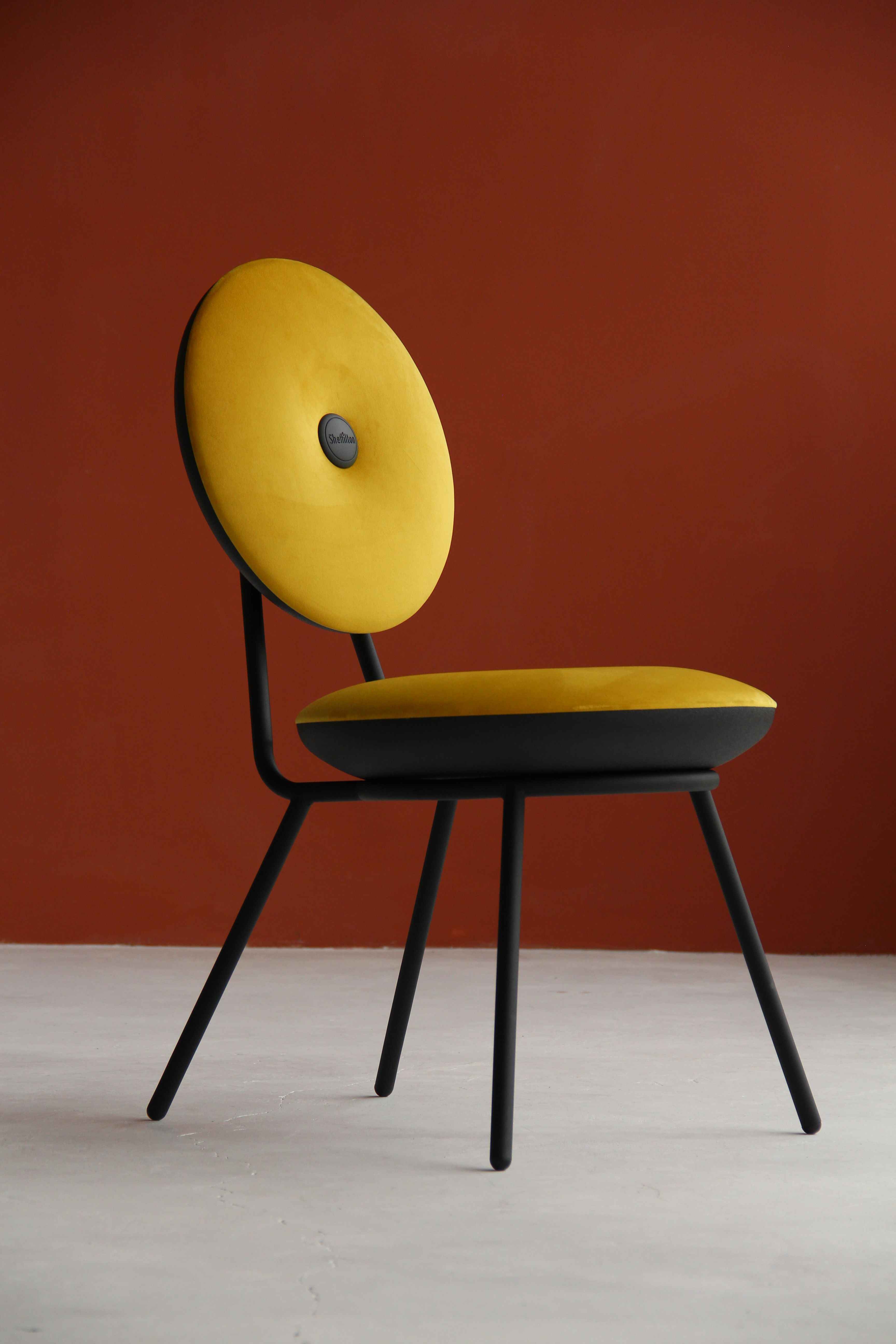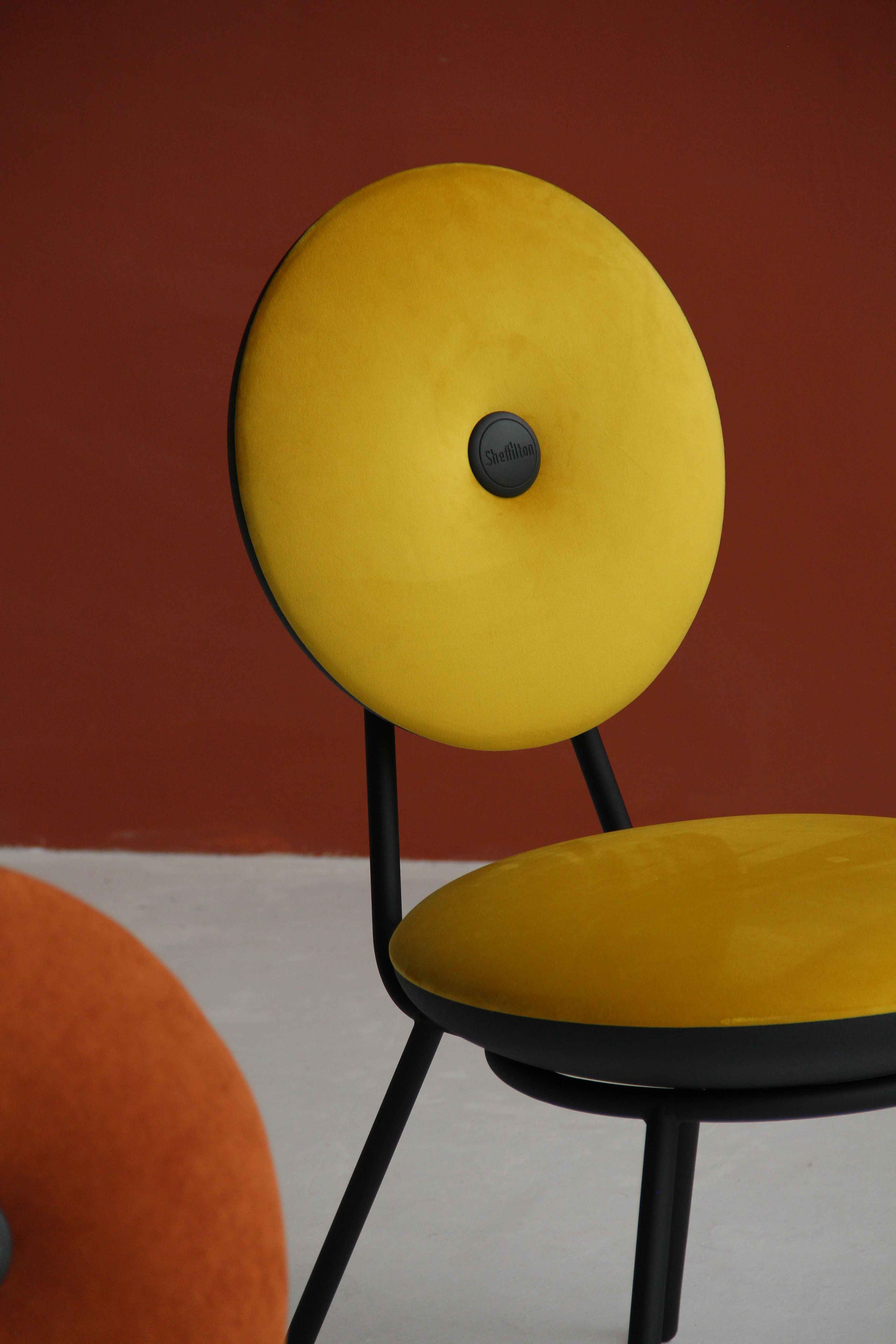 Мягкие объемные элементы на металлическом каркасе создают ощущение легкости и современности. Яркое цветовое исполнение делает модель выразительной, а минималистичная форма позволяет легко вписать стул в офисы, кафе, коворкинги, арт-пространства, лаунж-зоны и современные домашние интерьеры.