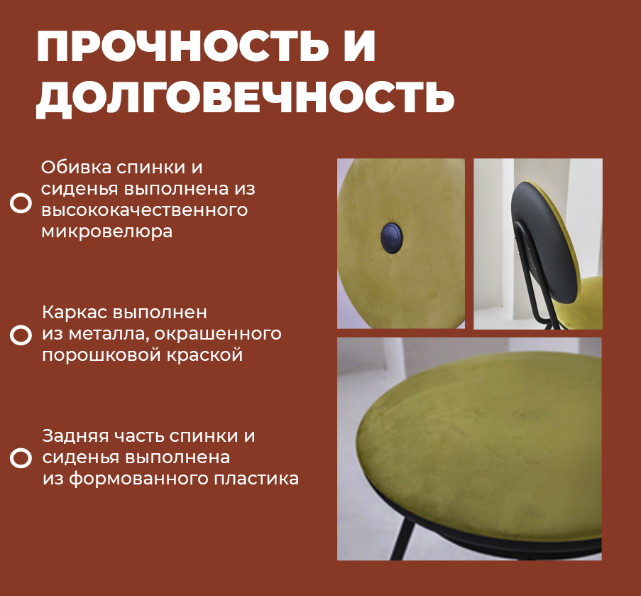 Обивка стула выполнена из качественного микровелюра — тактильного, износостойкого и простого в уходе материала.