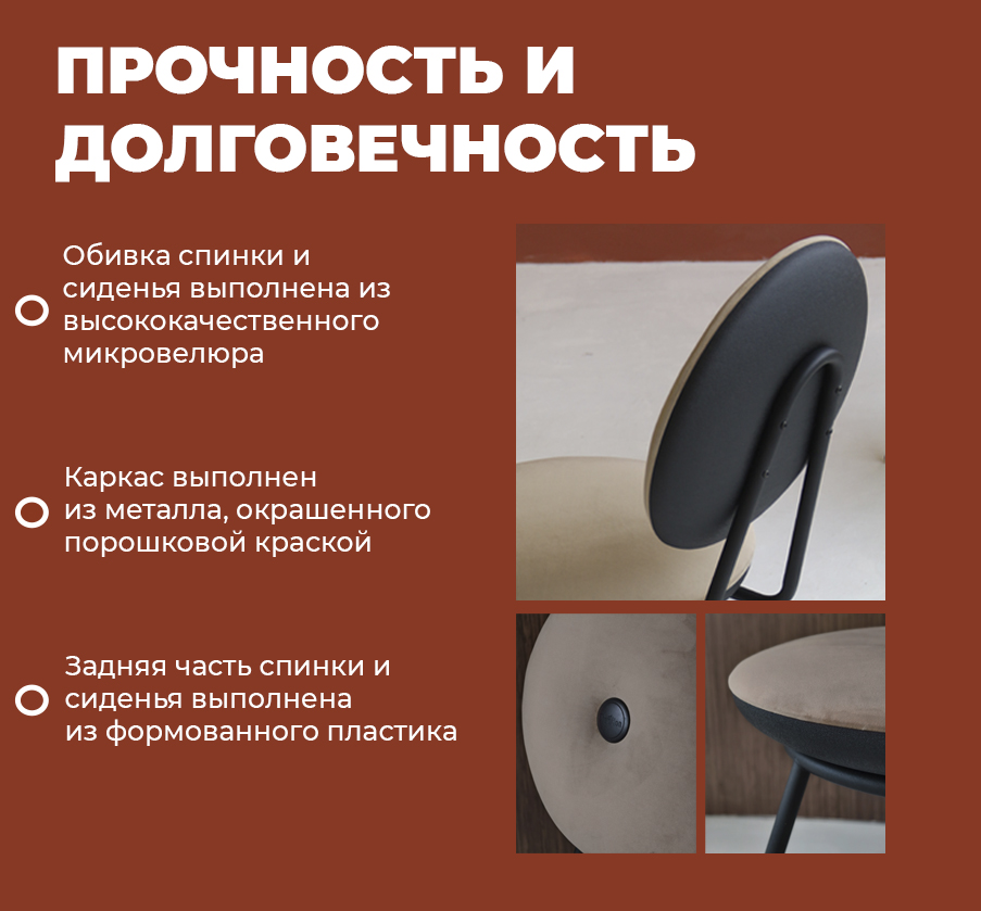 Обивка стула выполнена из качественного микровелюра — тактильного, износостойкого и простого в уходе материала.