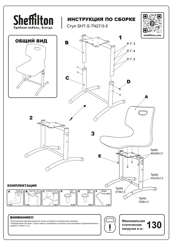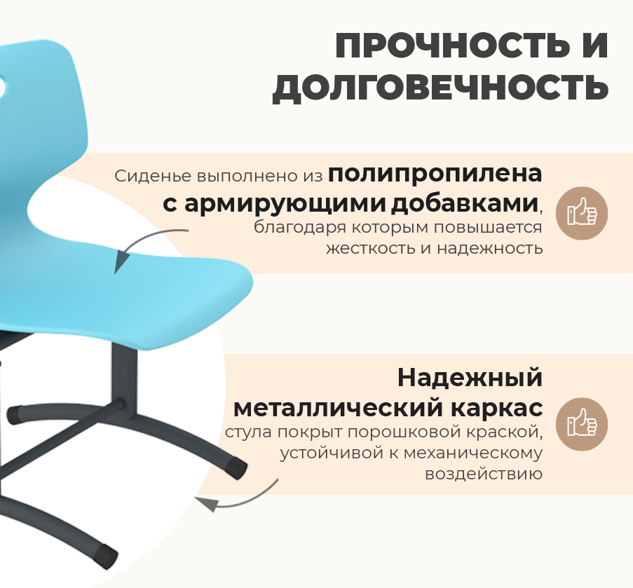 Сиденье выполнено из утолщенного пластика с армирующими добавками, что значительно увеличивает его жесткость и надежность. Надежный металлический каркас стула выполнен металла, покрытого порошковой краской, устойчивой к механическому воздействию. Каждый стул проходит строгие испытания на устойчивость, выдерживая более 50 000 циклов нагружения "сел-встал", что гарантирует его долговечность даже при интенсивном использовании.