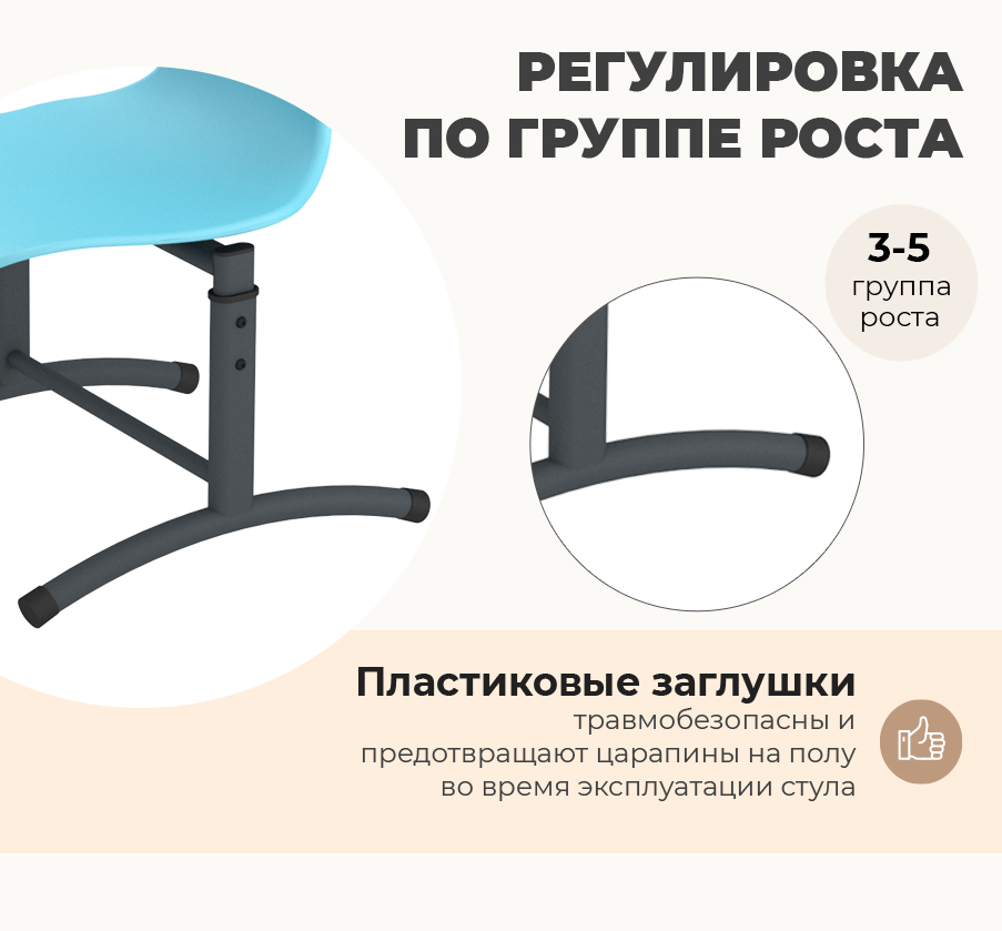 Функция регулировки по высоте обеспечивает комфортное положение и поможет в выработке правильной осанки. Регулируются по высоте на 3-5 группы роста. В каждую упаковку стула вложены наклейки с номерами ростовых групп — вы можете использовать их для удобной маркировки.