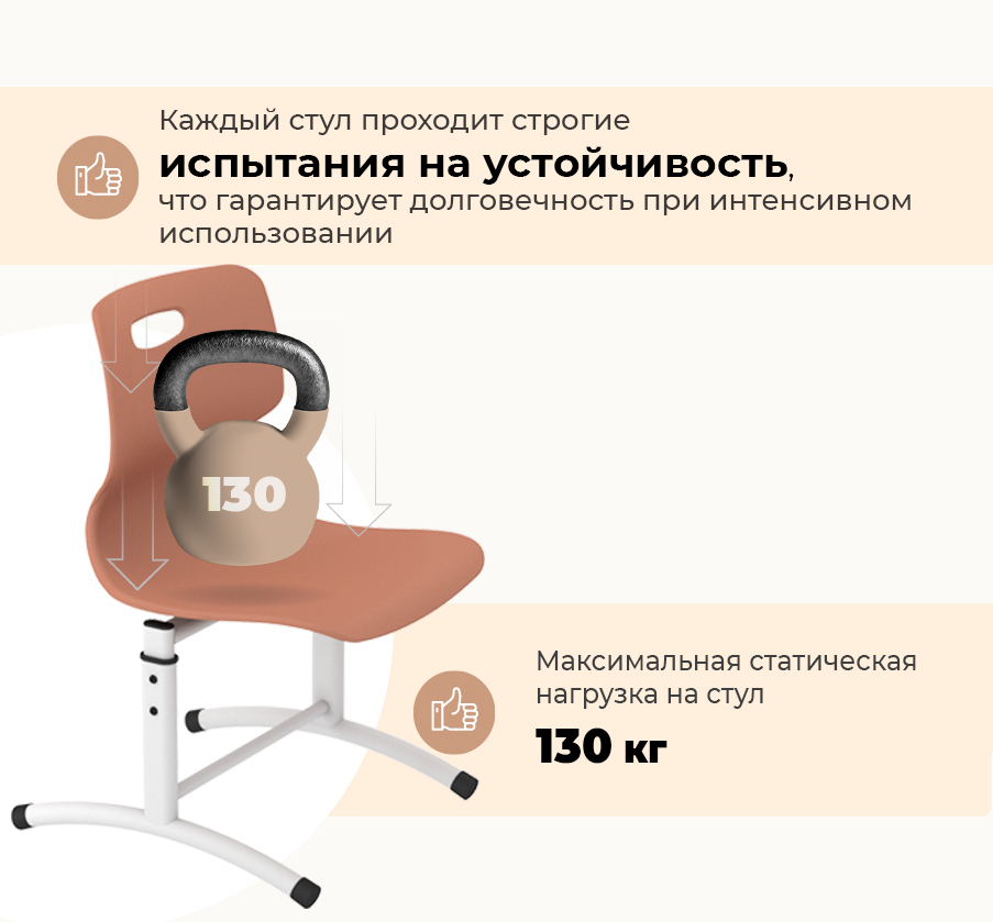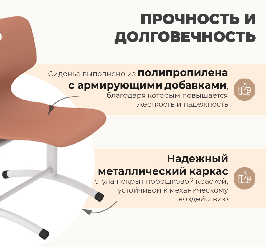 Сиденье выполнено из утолщенного пластика с армирующими добавками, что значительно увеличивает его жесткость и надежность. Надежный металлический каркас стула выполнен металла, покрытого порошковой краской, устойчивой к механическому воздействию. Каждый стул проходит строгие испытания на устойчивость, выдерживая более 50 000 циклов нагружения "сел-встал", что гарантирует его долговечность даже при интенсивном использовании.