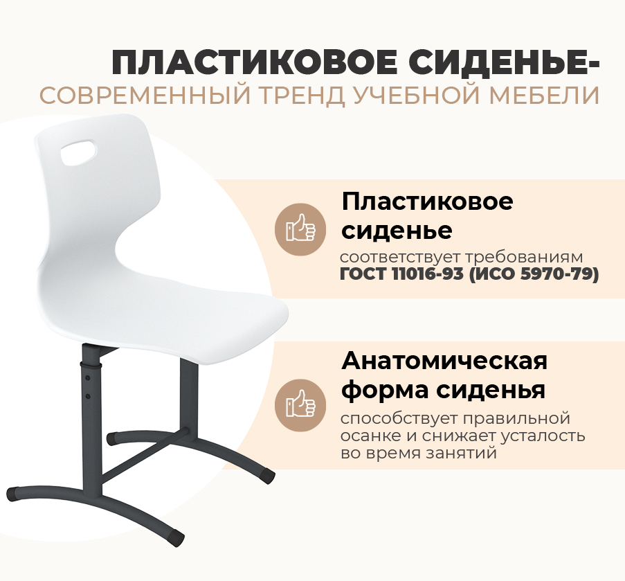 АНАТОМИЧЕСКАЯ ФОРМА СИДЕНЬЯ способствует правильной осанке и снижает усталость во время занятий. На спинке предусмотрено отверстие для руки, что делает перемещение стула простым и удобным.
