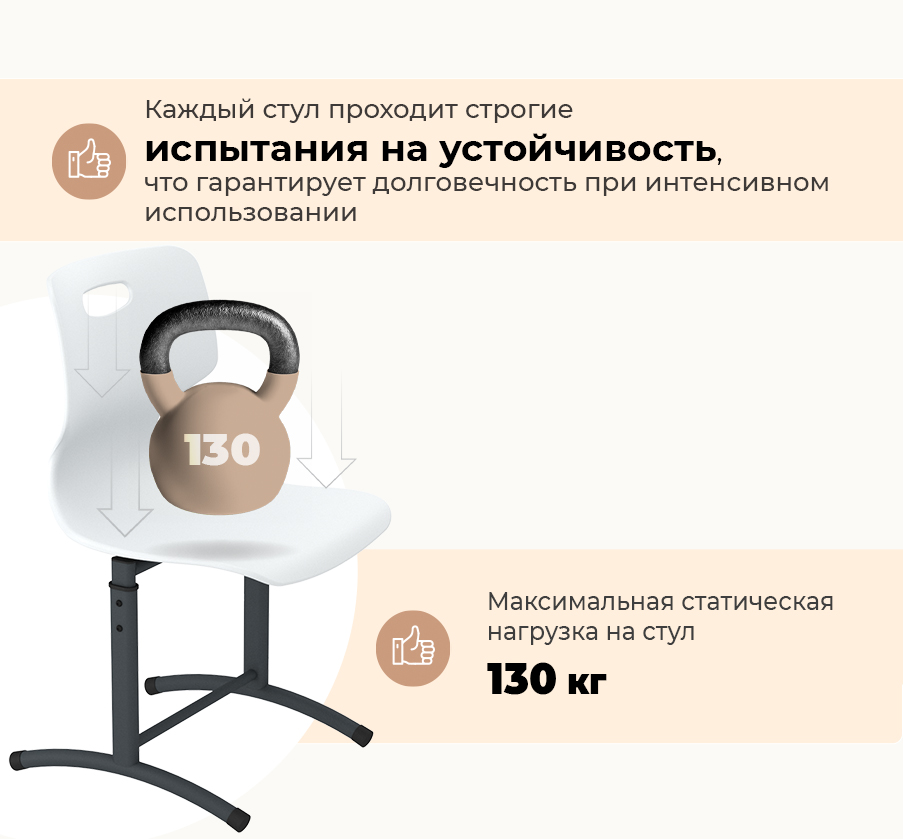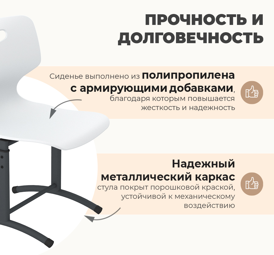 Сиденье выполнено из утолщенного пластика с армирующими добавками, что значительно увеличивает его жесткость и надежность. Надежный металлический каркас стула выполнен металла, покрытого порошковой краской, устойчивой к механическому воздействию. Каждый стул проходит строгие испытания на устойчивость, выдерживая более 50 000 циклов нагружения "сел-встал", что гарантирует его долговечность даже при интенсивном использовании.