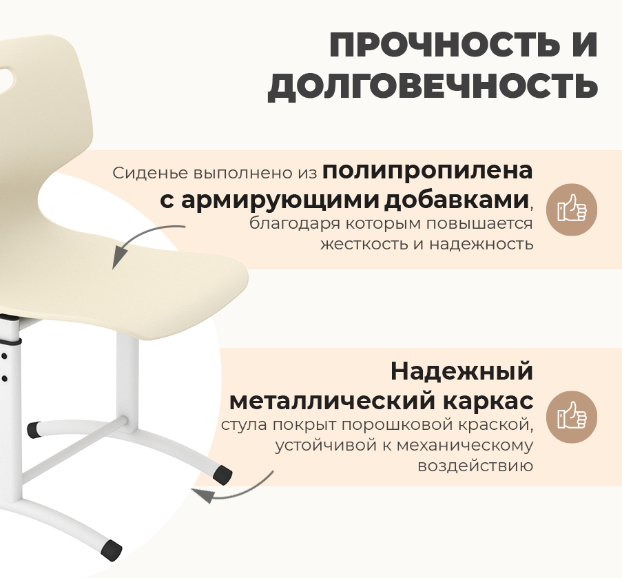 Сиденье выполнено из утолщенного пластика с армирующими добавками, что значительно увеличивает его жесткость и надежность. Надежный металлический каркас стула выполнен металла, покрытого порошковой краской, устойчивой к механическому воздействию. Каждый стул проходит строгие испытания на устойчивость, выдерживая более 50 000 циклов нагружения "сел-встал", что гарантирует его долговечность даже при интенсивном использовании.