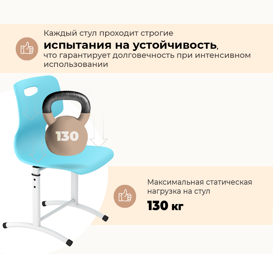 Сиденье выполнено из утолщенного пластика с армирующими добавками, что значительно увеличивает его жесткость и надежность. Надежный металлический каркас стула выполнен металла, покрытого порошковой краской, устойчивой к механическому воздействию. Каждый стул проходит строгие испытания на устойчивость, выдерживая более 50 000 циклов нагружения "сел-встал", что гарантирует его долговечность даже при интенсивном использовании.