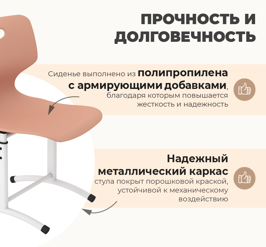 Сиденье выполнено из утолщенного пластика с армирующими добавками, что значительно увеличивает его жесткость и надежность. Надежный металлический каркас стула выполнен металла, покрытого порошковой краской, устойчивой к механическому воздействию. Каждый стул проходит строгие испытания на устойчивость, выдерживая более 50 000 циклов нагружения "сел-встал", что гарантирует его долговечность даже при интенсивном использовании.