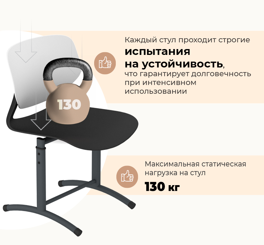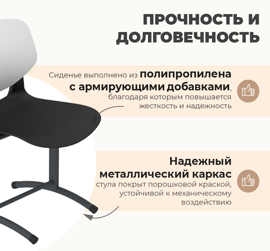 Сиденье выполнено из утолщенного пластика с армирующими добавками, что значительно увеличивает его жесткость и надежность. Надежный металлический каркас стула покрыт порошковой краской, устойчивой к механическому воздействию. Каждый стул проходит строгие испытания на устойчивость, выдерживая более 50 000 циклов нагружения "сел-встал", что гарантирует его долговечность даже при интенсивном использовании.