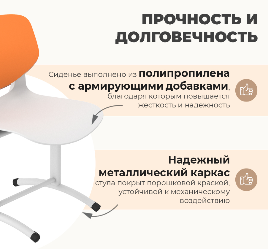 Сиденье выполнено из утолщенного пластика с армирующими добавками, что значительно увеличивает его жесткость и надежность. Надежный металлический каркас стула покрыт порошковой краской, устойчивой к механическому воздействию. Каждый стул проходит строгие испытания на устойчивость, выдерживая более 50 000 циклов нагружения "сел-встал", что гарантирует его долговечность даже при интенсивном использовании.