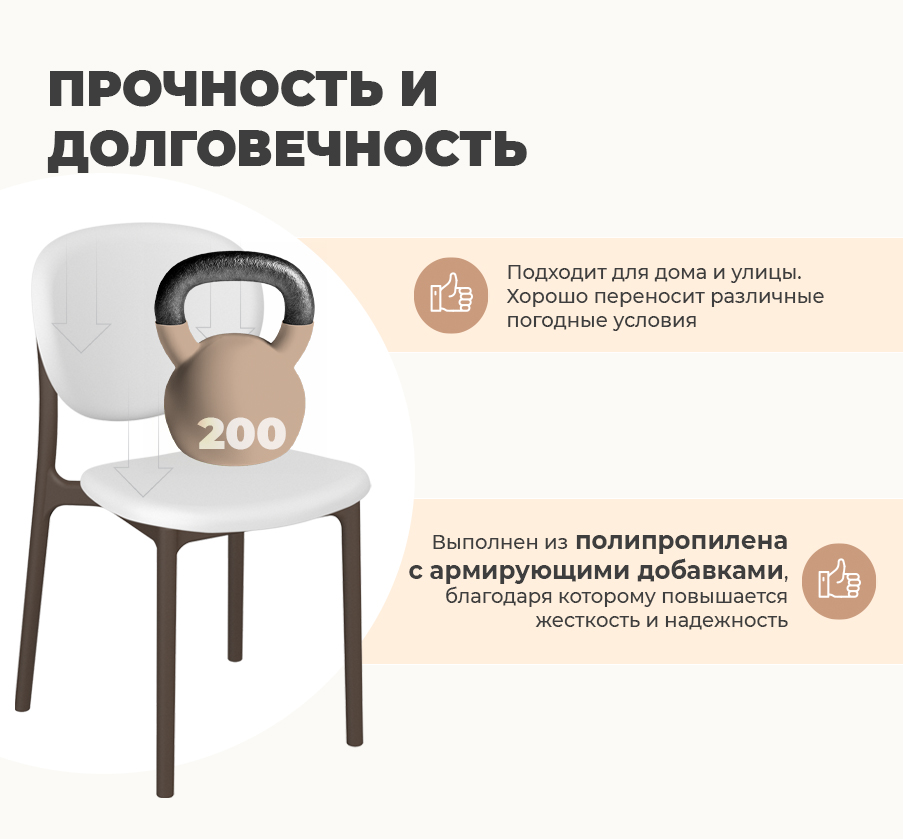 Стул выполнен из полипропилена с армирующими добавками, благодаря которым повышается жесткость и надежность. Изделие устойчиво к ударным воздействиям, негативным воздействиям окружающей среды и появлению царапин.