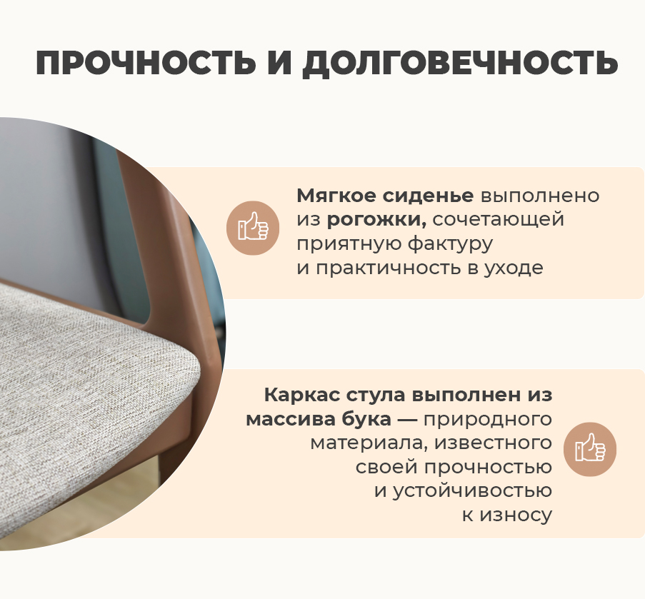 Каркас стула выполнен из массива бука — природного материала, известного своей прочностью и устойчивостью к износу. Мягкое сиденье выполнено из рогожки, сочетающей приятную фактуру и практичность в уходе. Каждый элемент стула SHT-S202 продуман до мелочей, чтобы сохранять форму и стабильность даже при ежедневном использовании.