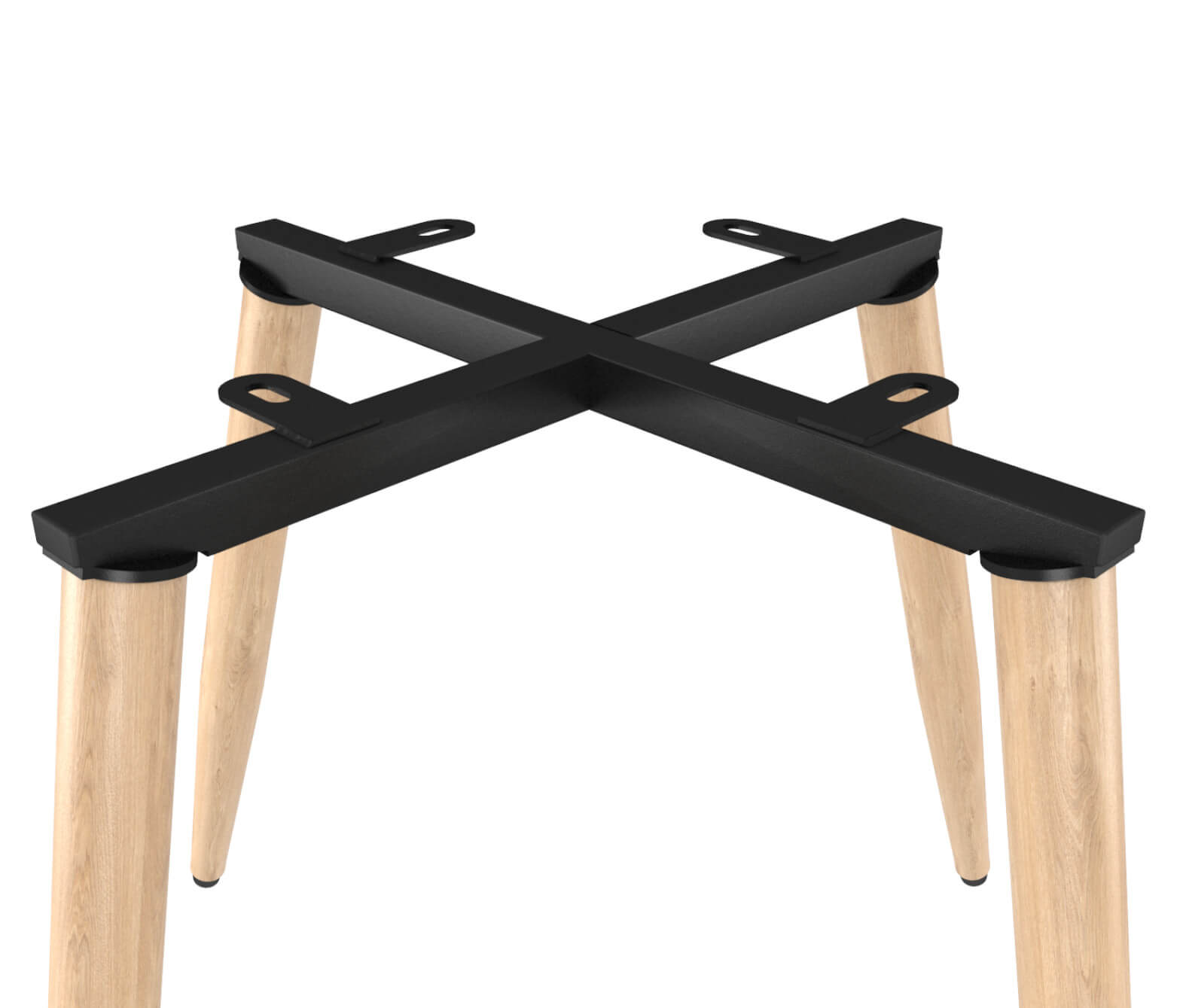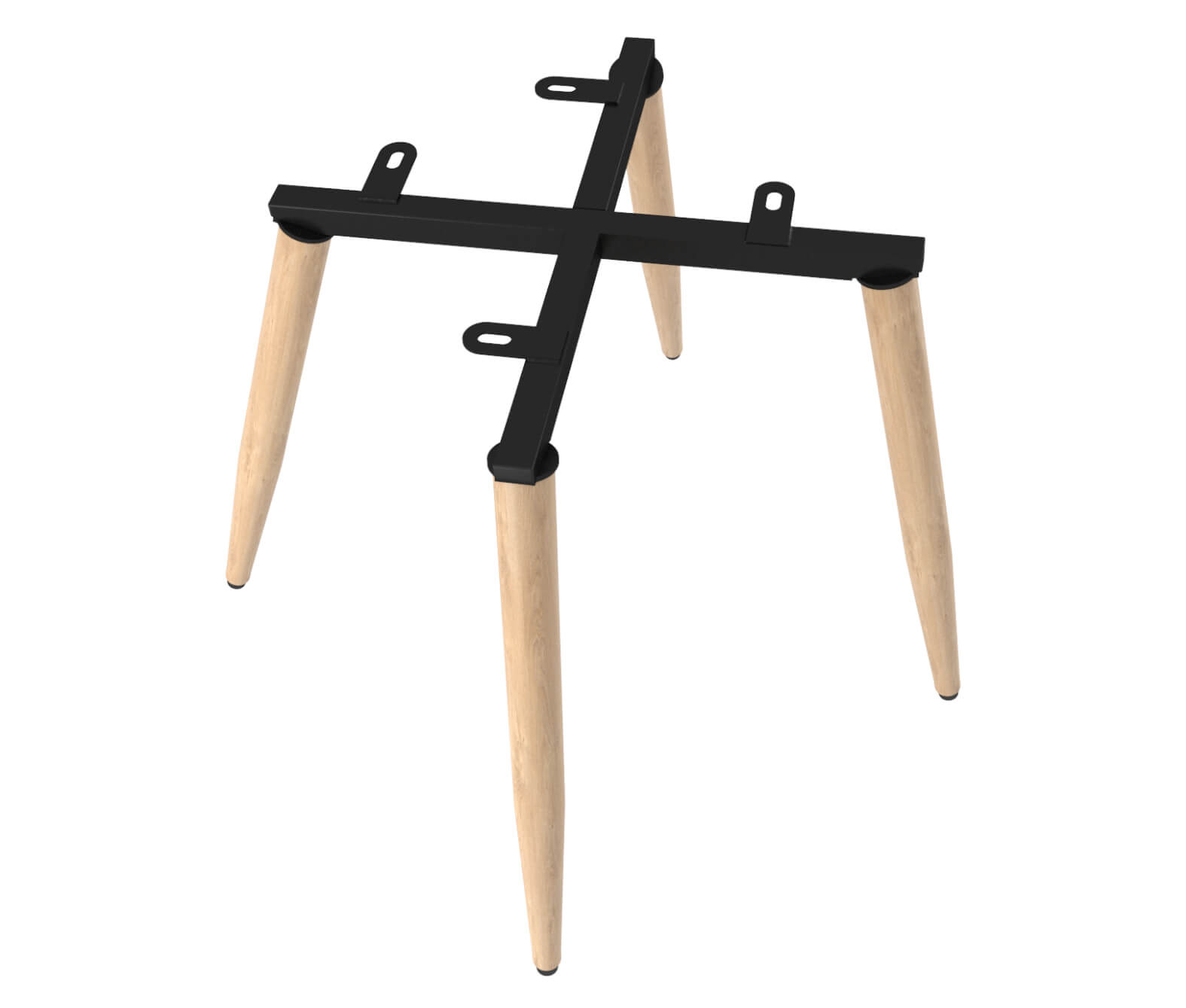 Ножки каркаса выполнены из натурального дерева (бук), на котором отчетливо видна текстура дерева. Верхняя крестовина каркаса с приваренными фланцами выполнена из квадратной трубы. Максимальная статическая нагрузка на каркас – 200 кг.