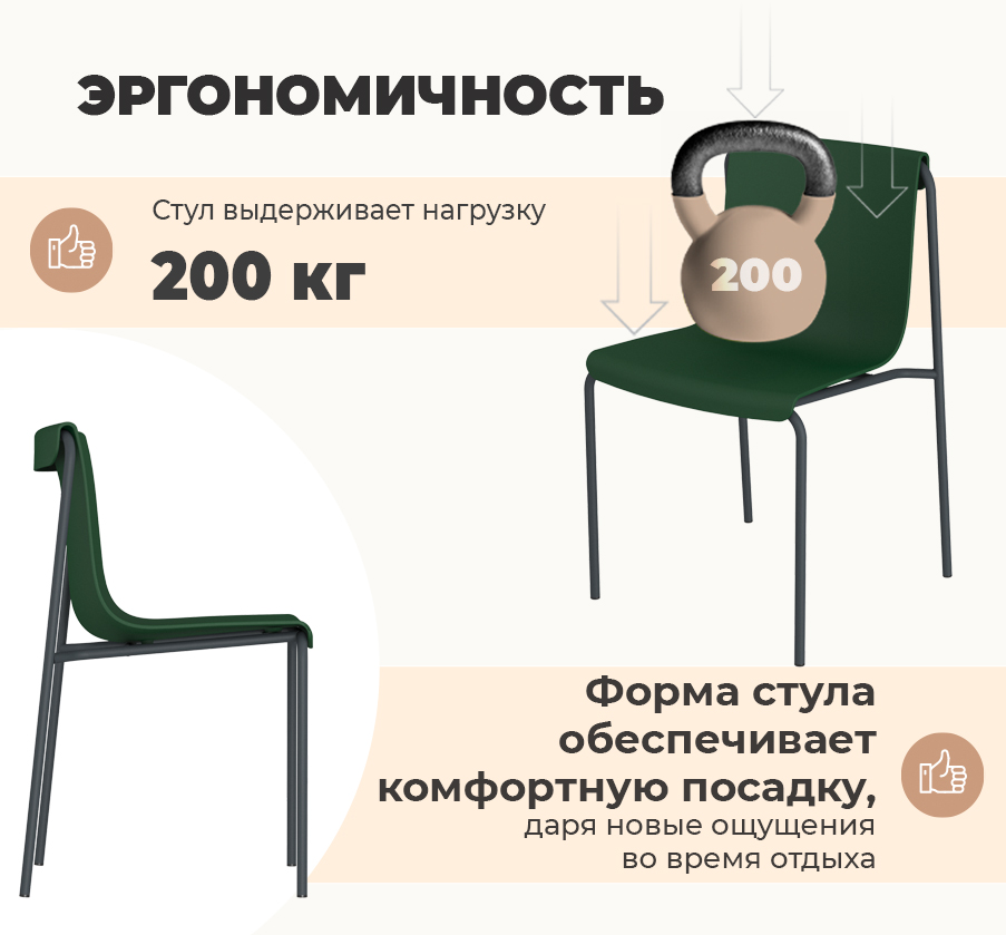 Каждый стул проходит строгие испытания на устойчивость, что гарантирует его долговечность даже при интенсивном использовании.