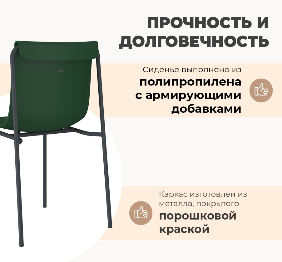 Сиденье изготовлено из полипропилена с армирующими добавками. Каркас стула выполнен из металла с порошковым покрытием. Все это обеспечивает высокую жесткость и надежность конструкции. Стул устойчив к ударам, воздействиям окружающей среды и появлению царапин.